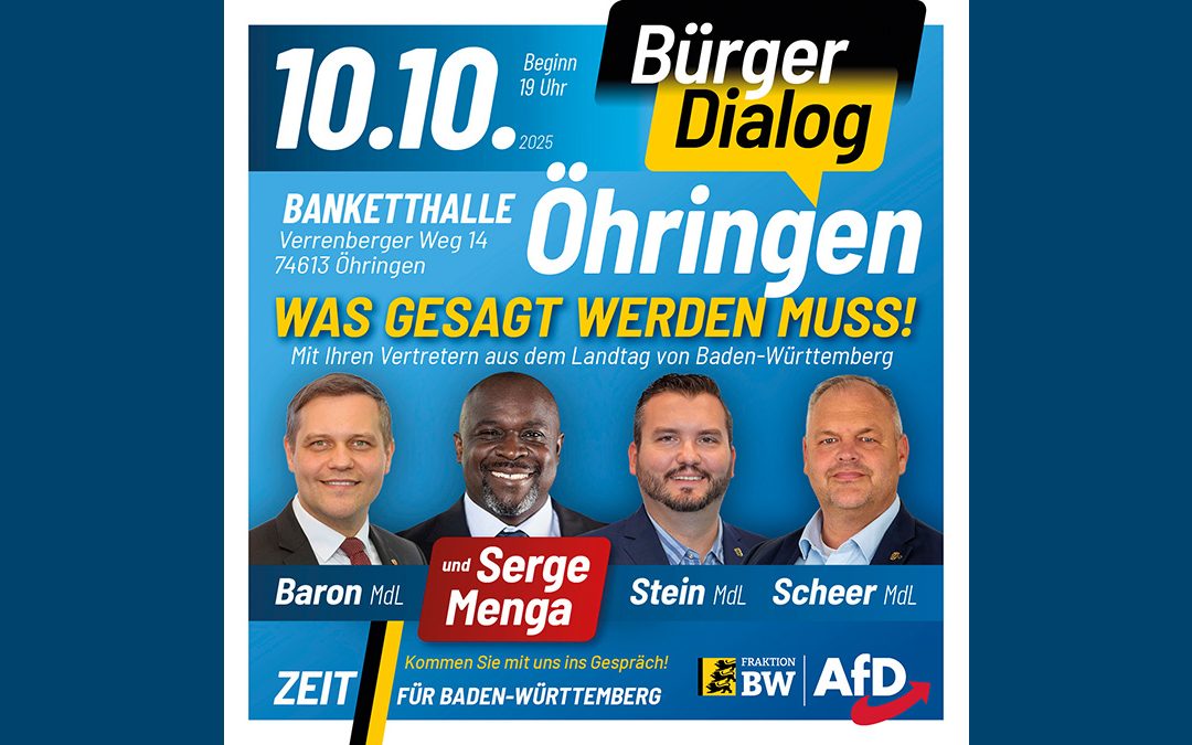 Unser Fraktionsvorsitzender Anton Baron MdL, die Landtagsabgeordneten Udo Stein und Sandro Scheer sowie der politische Aktivist Serge Menga werden euch über unsere Positionen zu folgenden aktuellen Themen informieren: die Wirtschaftskrise in Baden-Württemberg, die Lage der Jägerschaft und die bröckelnde innere Sicherheit. Außerdem werden sie euch über die Arbeit im Landtag berichten.